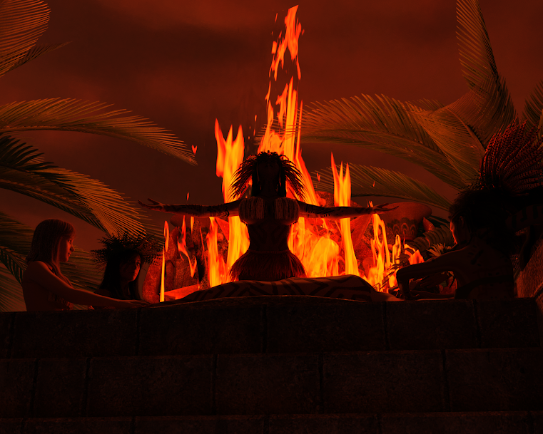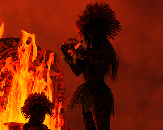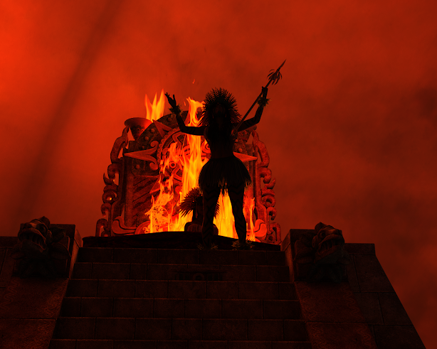 The women carrying him on the throne came to a stop as they reached the bottom steps of the temple. They quickly placed him down and moved around for him and untied him and started to carry him up with stone steps of the macabre temple. As they carried him to the top of the temple, he looked back to see the chanting crowd that stretched into the tree lines that surrounds the Aztec like the temple and its grounds. He then glanced back to the top of the temple where he was now arriving. His heart dropped as he noticed who all the people around the sacrificial alter were. Sruna and Takire, Kenyanire, Yantraki, Aosliope all still around the altar waiting for him, and next to them were the brown-haired girls holding a large sacrificial dagger. They all look different in their attire but the one thing that was the same was this serious expression on their faces.