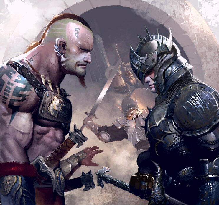 Greatsword swept off his shoulders, he watched the others form a circle around them, Daria glaring at him, when the knight came forward in a shield charge. The light that suddenly blazed from Gauldryon’s armour, evaporating into nothing as Gregor smirked, and came forward. Their footwork and swordwork, brilliant as his greatsword, met the knight’s shield in a thunderous crash of sparks, both of them circling and probing each other for weakness. But even in an equal battle with no spells, Gregor with his considerable size and speed, quickly put the holy warrior on the back foot, forcing him backward time and time again, when Gauldryon with a guttural growl unleashed another bar of light.