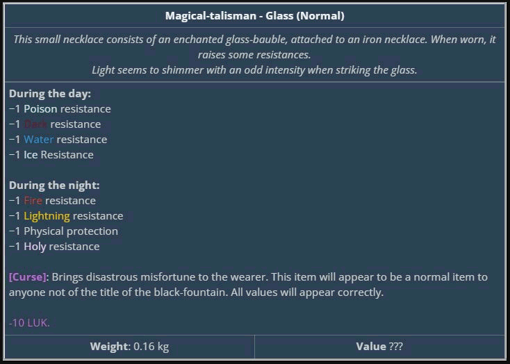 This small necklace consists of an enchanted glass-bauble, attached to an iron necklace. When worn, it raises some resistances.
