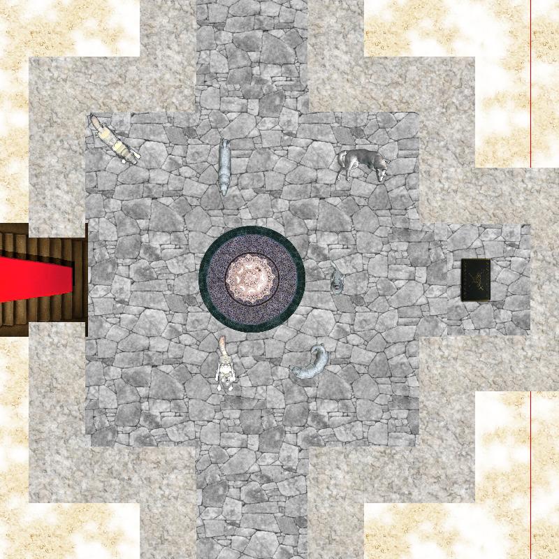 Under the illusion was no column, but a statue of six foxes standing next to and even on each other. They are extremely life-like as if they had been frozen in that position. Before anyone can touch them however Shadowhand Samantha calls. "Wait - that's no statue, they are caught in a stoning trap."