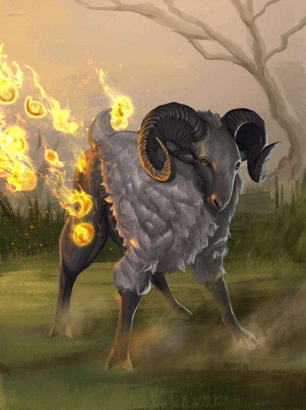 Aggravated, the sheep snorted and shook its body. Large amounts of light wool swirled in the wind and stuck to the man. With another angry grunt, the animals wool ignited and set the surrounding area on fire.