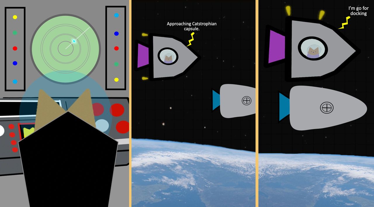 Once in the same orbit as the other ship, only small thruster firings (too small to affect his orbit) were needed to move Major Tom towards the other ship. From there it was just a matter of Major Tom having nerves of steel to dock with the other ship and replenish his fuel. Now he’d best quickly prepare for reentry as his air supply is nearly gone. But for us, that will have to wait until the next spine-tingling installment of Rocket Cat.