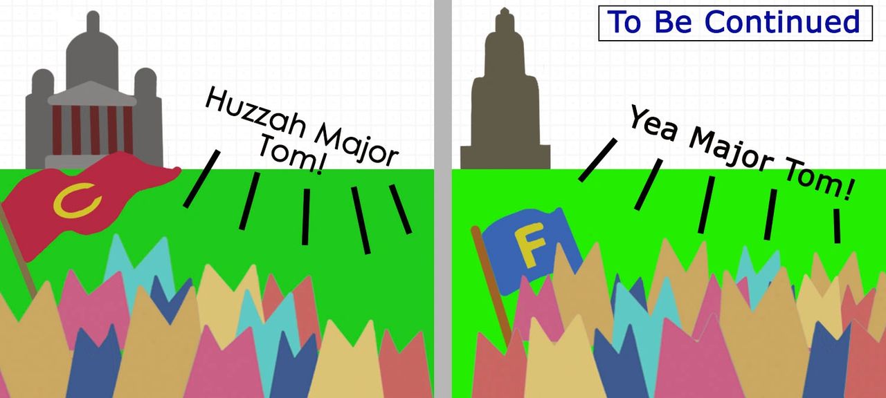 Catstroph’s leaders hastily called a press conference and offered the use of their country’s rocket: the one they’d hoped would beat Felinia to space. Although still unable to carry passengers, it could get much needed fuel to the stranded Felinian ship. Felinia’s leaders had no choice but to accept their enemies help or they’d be blamed for Major Tom’s demise.