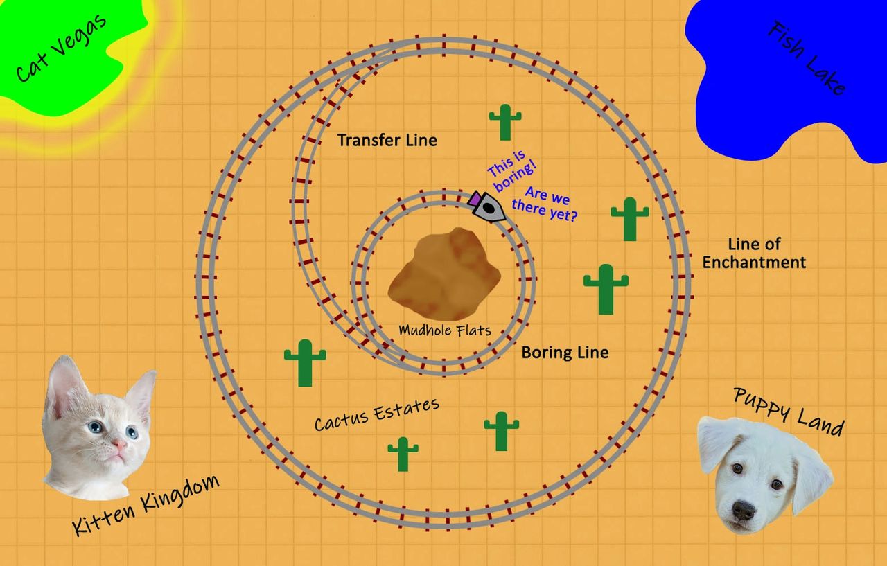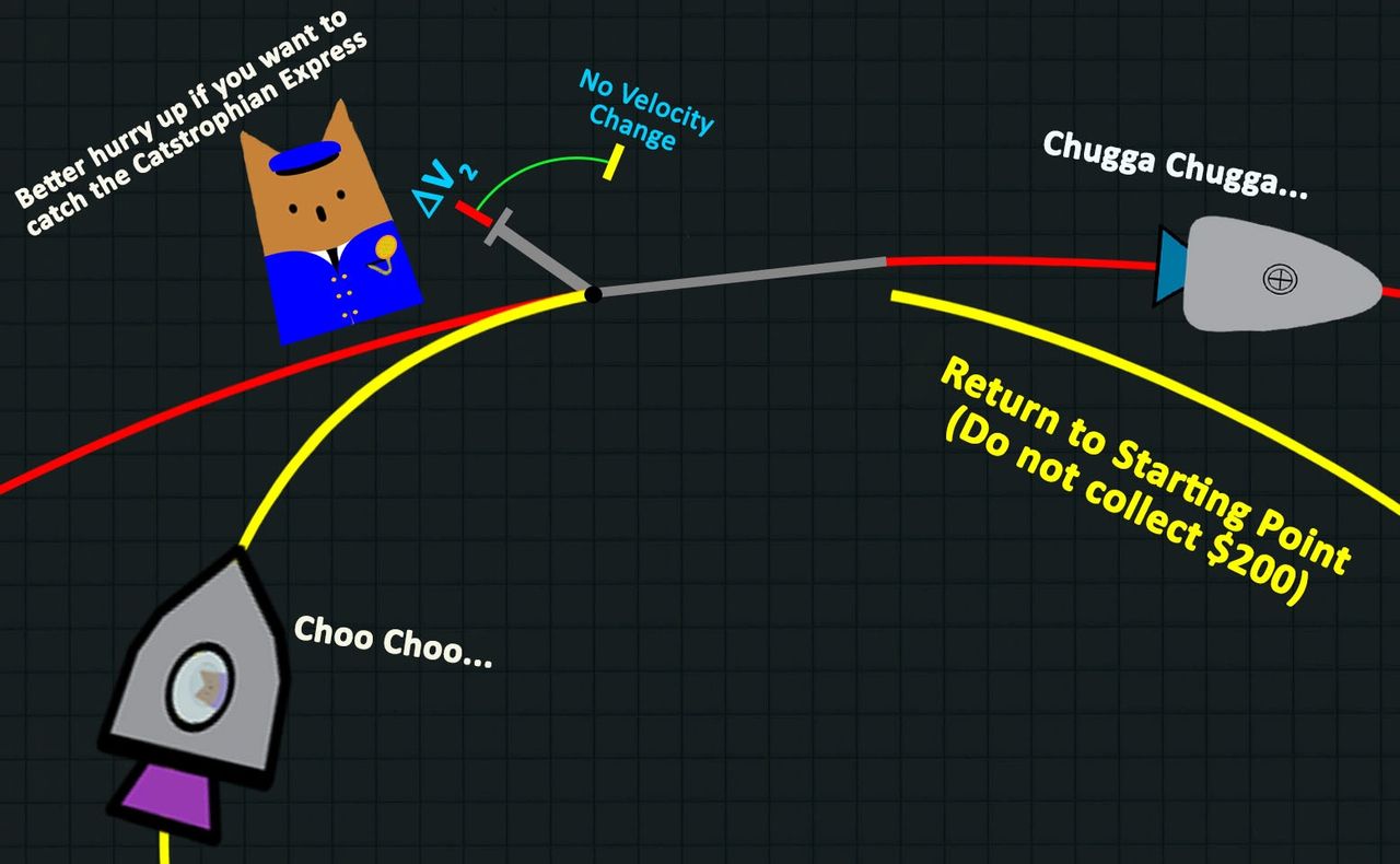 In our story Major Tom had to fire his engine a second time. Without the second engine firing he’d stay in the transfer orbit and end up right back where he started. To stay in the Catstrophian’s ship orbit, he had to adjust his velocity. It’s like using a switching post to change to a different railroad line.