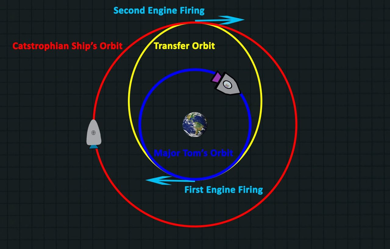 And why was the second engine firing 45 minutes later? That’s because Major Tom had to travel half an orbit to reach the Catstrophian ship’s orbit. Since it takes 90 minutes for a complete orbit (there’s an equation for that too, but I’ll resist the temptation to include it), half that is 45 minutes.