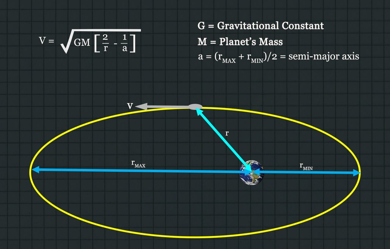 In Part 1 of Rocket Cat we calculated the orbital velocity for a circular orbit. The orbital velocity for an elliptical orbit is more complicated because it changes as you move around the planet. But what’s a complicated equation between friends. So without further ado we present to you the elliptical orbit velocity equation.