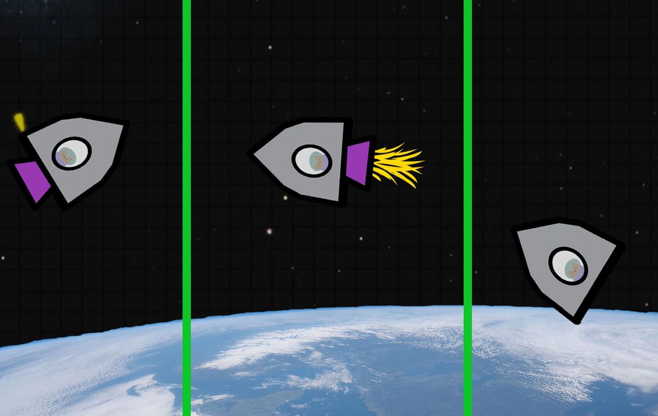 His final task was to fire the ship’s maneuvering thrusters to rotate his capsule until it was flying backwards. Now the engine firing would reduce his velocity and lower his orbit into the atmosphere. Watching the clock, Major Tom held his paw over the ignition button as he received final instructions on how long to fire the engine.