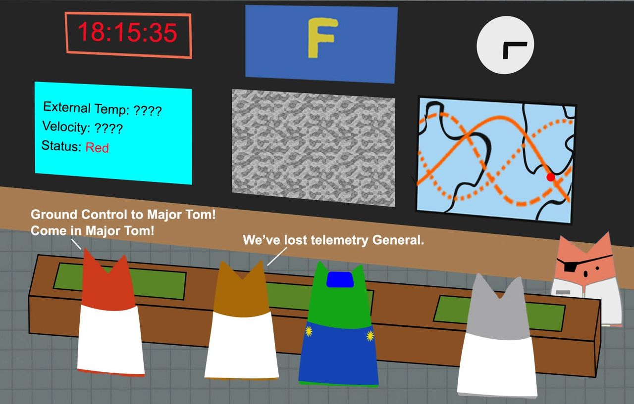 Back in Ground Control, scientists worked feverishly to devise a reentry trajectory that would get Major Tom to the ground in time. There was only one option, Major Tom would have to land in Catstrophian territory. (What, were you expecting a water landing? We’re talking cats here.)