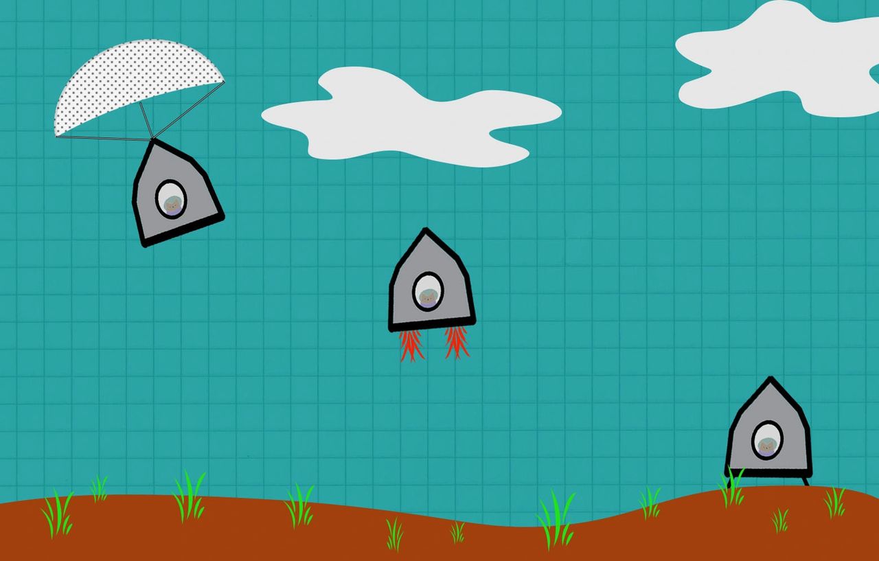 With only three minutes of air left, a loud pop followed by a dull roar could be heard as the parachutes were released and the retro rockets came to life. The capsule slowly descended, the minutes ticking by. As the capsule landed with a soft bump, an alarm sounded; the last of his air was gone. Major Tom tore off his helmet and activated the switch to open the capsule door.