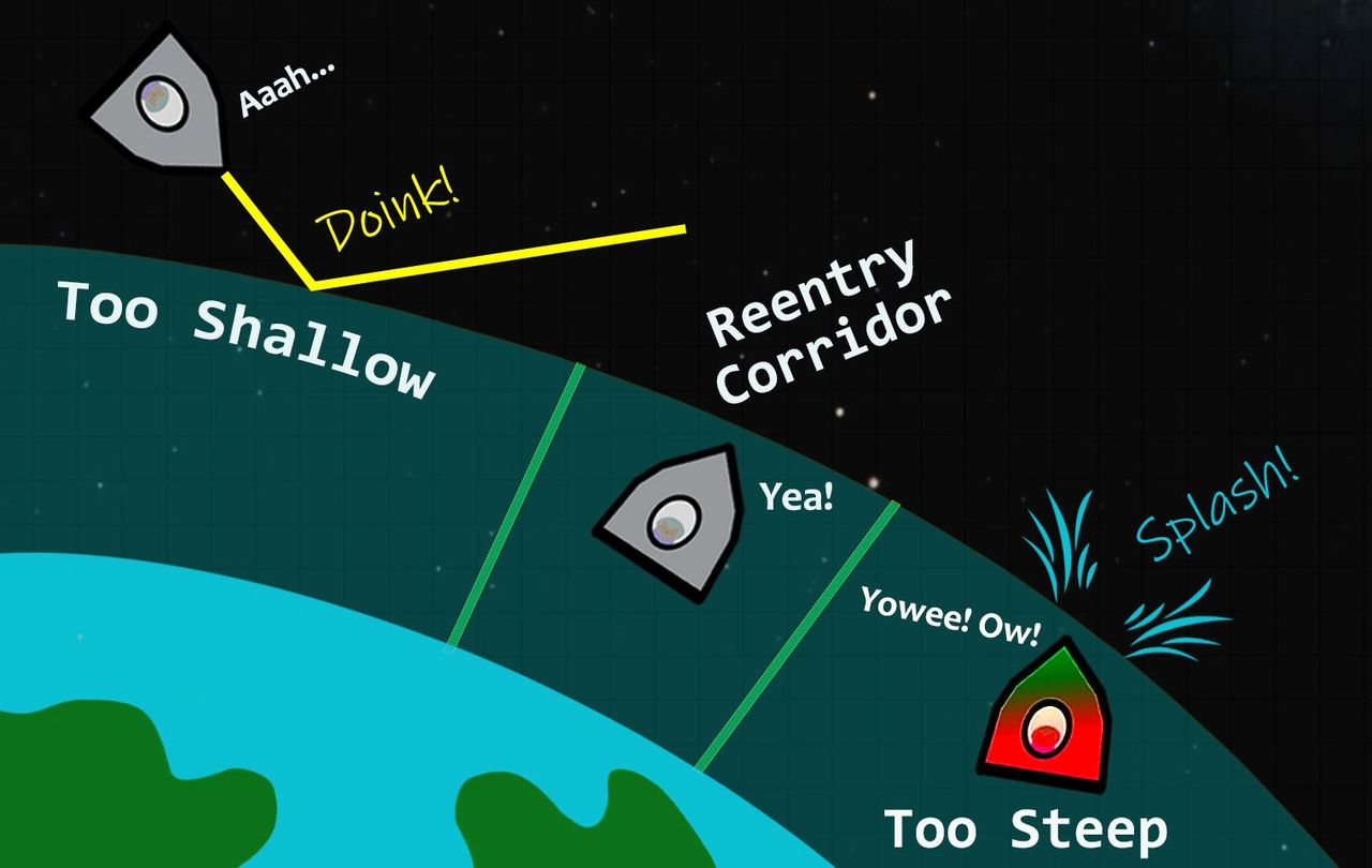 It’s exactly the same for a capsule entering the atmosphere. The angle at which it enters the atmosphere is called its reentry angle. For a too shallow reentry angle, the capsule would bounce off the atmosphere just like our rock skipping across the water. If the reentry angle is too steep, the capsule will “splash” into the atmosphere causing severe drag loads and high temperatures which would destroy the capsule.
