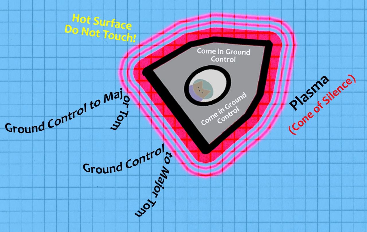 The dull red glow outside had morphed into bright red flames as the capsule plunged deeper into the atmosphere and was now shaking violently. “Altitude seventy-one …” was suddenly replaced with static in the capsule. On the ground, all contact with Major Tom had also been lost.