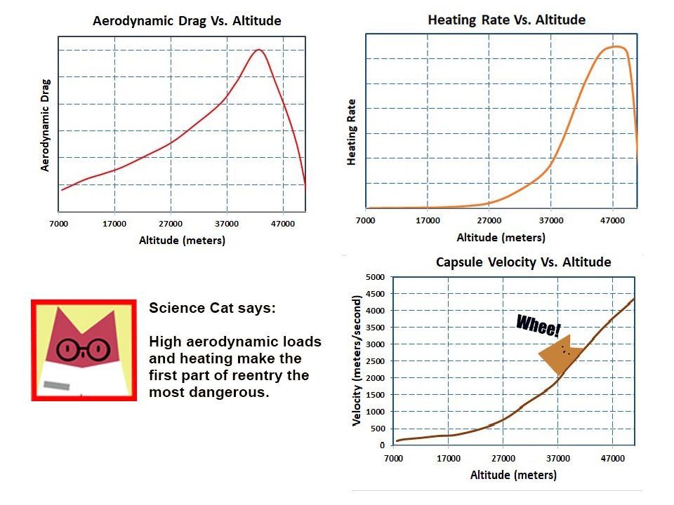 The peak aerodynamic drag load and aerodynamic heating both occur while the capsule in the upper atmosphere where the capsule’s velocity is still very high. Thus, the early part of reentry is the most critical because you have both high drag loads and high heating. It’s in this portion of the atmosphere where most meteorites burn up flashing across the night sky in a final blaze of glory.