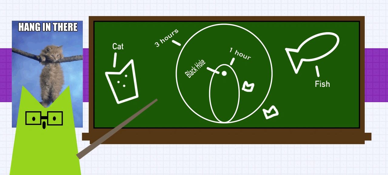 This equation tells us that for someone near the black hole time will move more slowly. Let’s say we have sleepy two cats; CB who is near the black hole and FA who’s far away. They want to nap for an hour and FA sets his alarm clock (which both will hear when it goes off) for one hour. When the alarm goes off; FA wakes up refreshed from his hour of sleep while CB is tired and upset that she only got a half-hour of sleep. So compared to FA, CB lost a half-hour of sleep by being near the black hole.