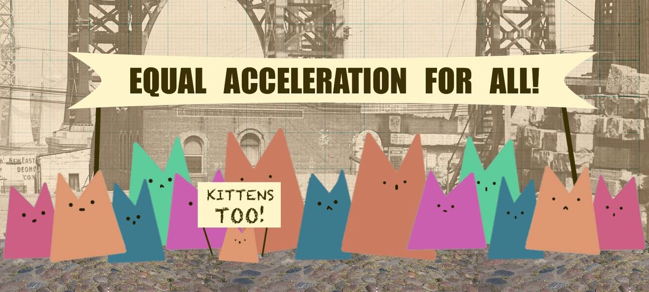As the cats plummet to the ground below, their speed increases. The amount that their speed changes every second is what’s known as acceleration. A car going from 0 to 60 miles per hour in 6 seconds (don’t try this at home) is a common example of acceleration. And do you know what’s causing the cats to accelerate, our old friend gravity.