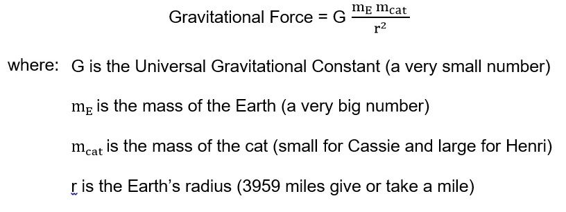 Now I'm no mathematician, but even I can tell from that equation that more gravitational force will act on Henri because she's heavier (not fatter mind you) than Cassie. So shouldn't Henri fall faster? Maybe we misjudged Aristotle. Just kidding. Actually, the force acting on each cat is only part of the story.