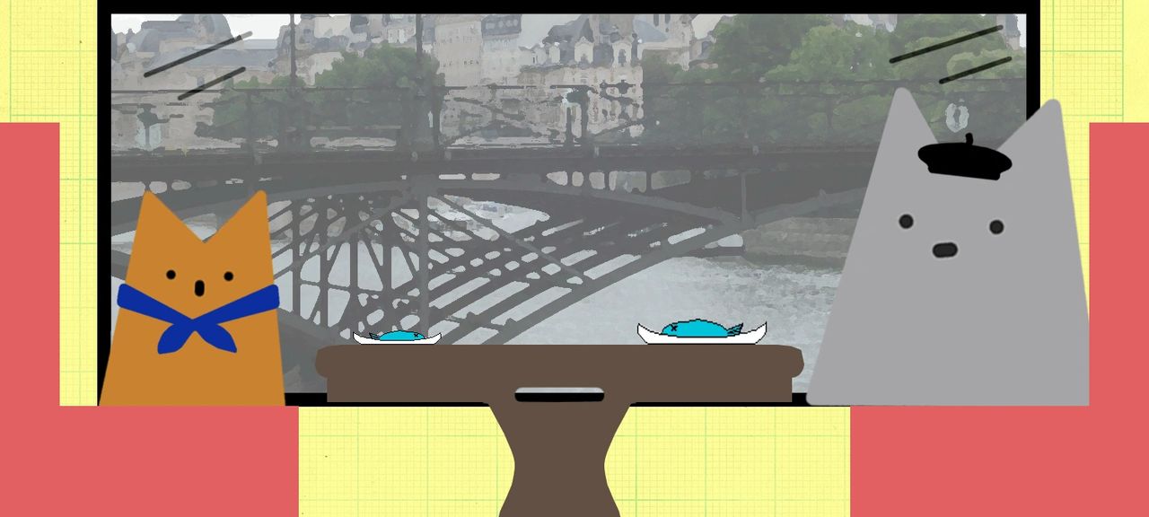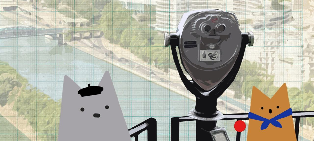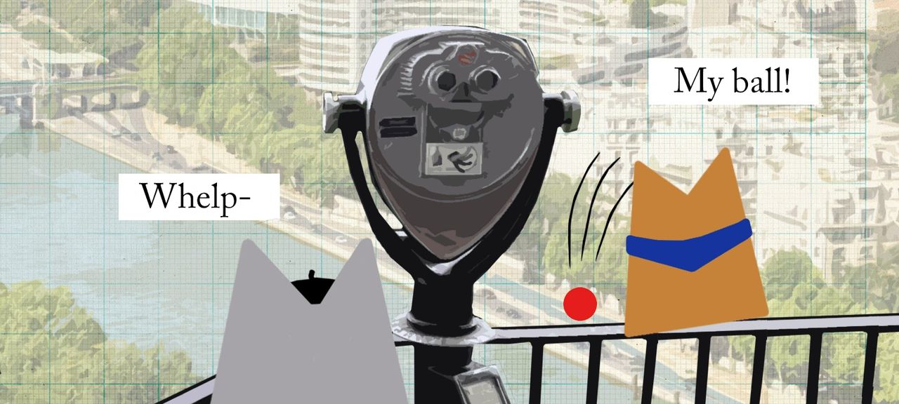 As we once again join our intrepid feline travelers Cassie and Henri, we find them atop the Eiffel Tower (though worry not for today there will be no falling cats). Henri stares at the beautiful city below and sighs wishing for someone to share the experience with.