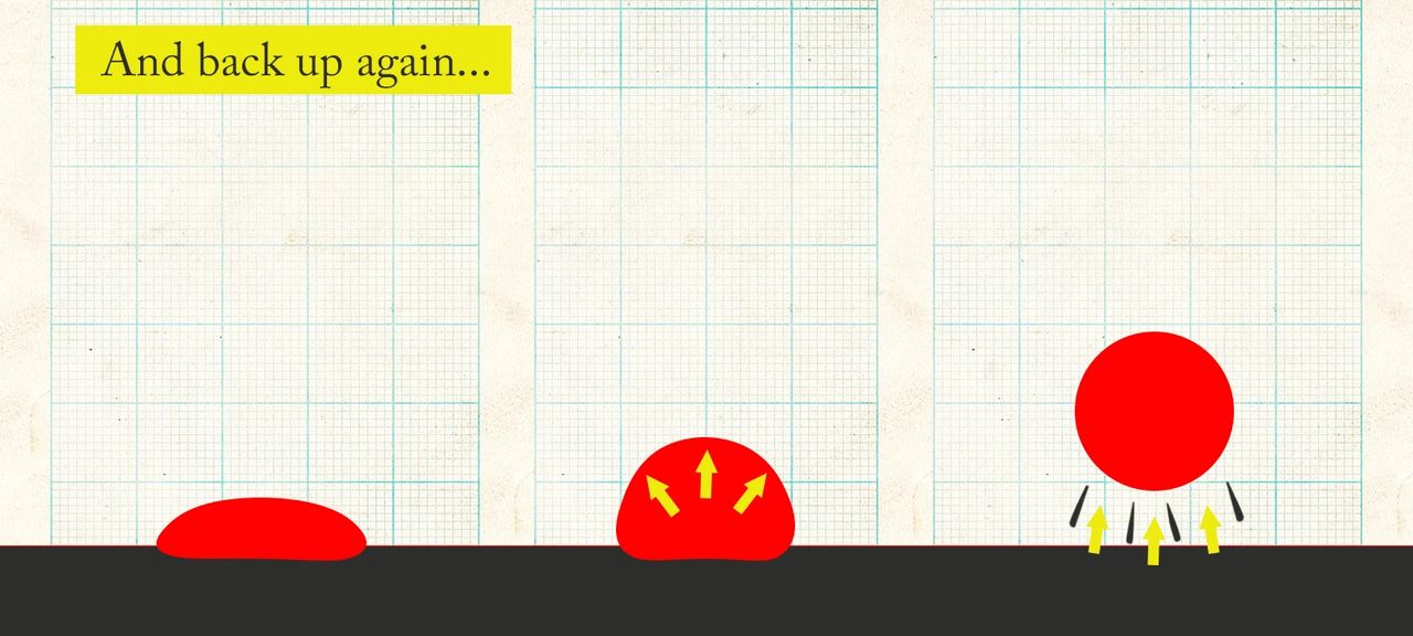 So what happen next? Well, the same thing that happens if you push on a spring and let go, it shoots back to its original size. Now everything goes in reverse, as the ball rebounds, its Elastic Potential Energy turns into Kinetic Energy which becomes Gravitational Potential Energy as the ball flies upward.