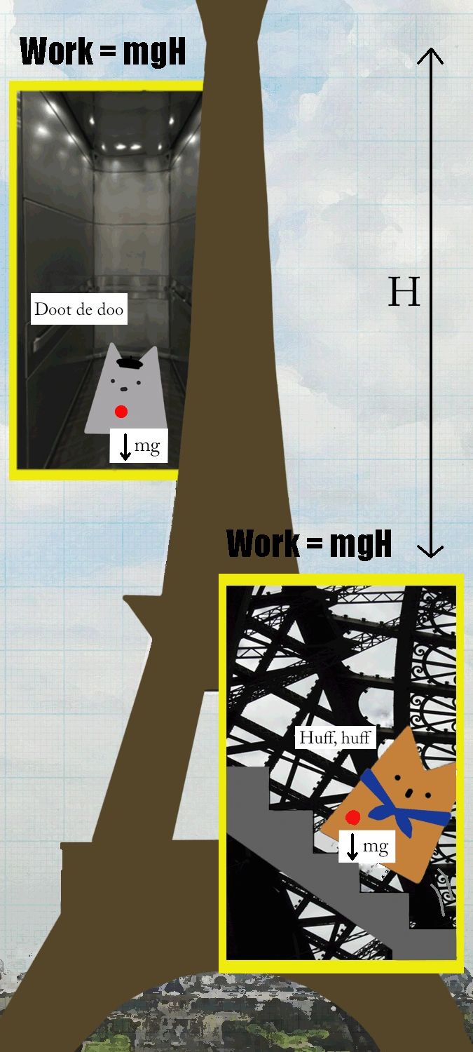 So the distance has to be the length of the stairway Cassie ran up, right? Actually, no. Since gravity only acts vertically, the only distance we care about is the height of the tower. And it doesn’t matter how you get to the top. Henri, being older and a bit larger (once again don't call her fat), of course took the elevator. If she’d taken the ball with her, the Work done on the ball would be the same. The only difference is that the elevator would be doing the Work.