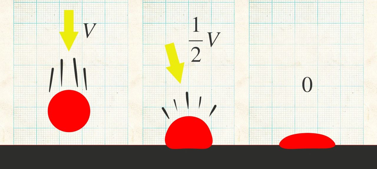 Generally if something hits the ground it’s going to stop moving. So what happens to all that Kinetic Energy the ball just had? Is conservation of energy just another myth propagated by well-meaning parents? Nope, as the ball flattens against the ground, the Kinetic Energy is converted into Elastic Potential Energy (boy, who’d have thought a falling ball could be so complicated?).