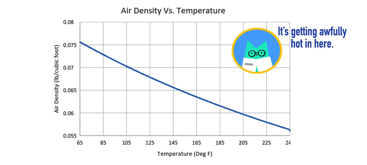 Now in the above equation, what happens to the air density if P and R don’t change, but T increases? Through the magic of graphs, we present: