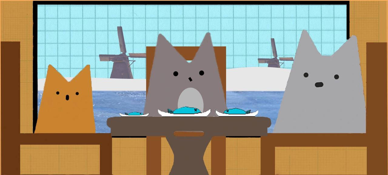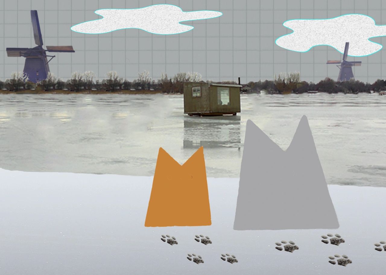 The larger feline walks briskly carrying a large backpack with excitement evident in each step. Behind her trudged a small kitten. It’s none other than our intrepid feline travelers, Henri and Cassie, who are spending this winter’s day in the Netherlands.