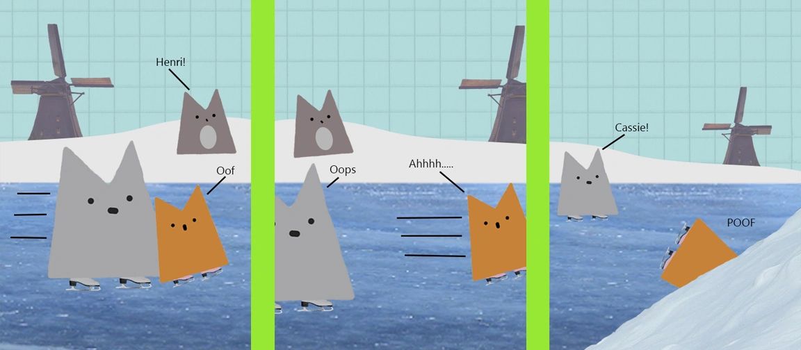 What happened when Henri ran into Cassie is what physicists call an elastic collision. In this type of collision, the total kinetic energy (the energy you have when moving) of the system doesn’t change. We looked at this when Henri and Cassie visited the Eiffel Tower.