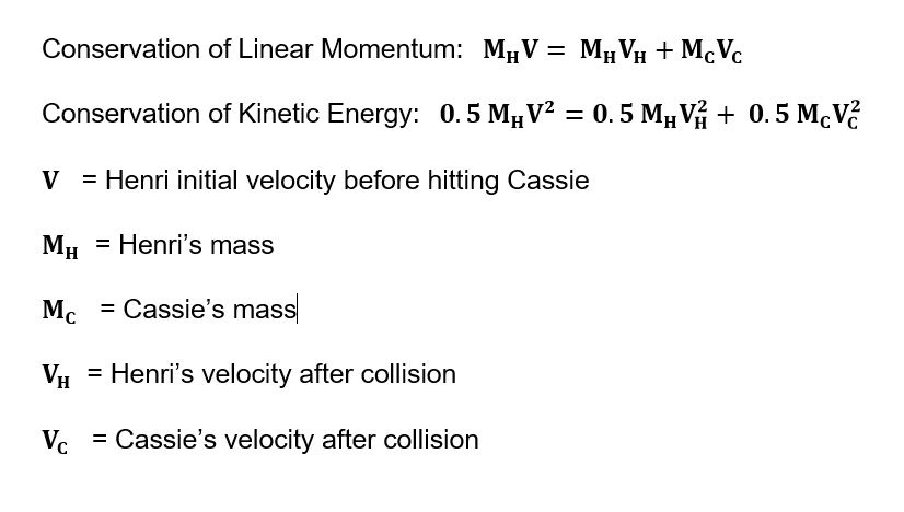 Applying the dark art of algebra to these equations we can solve for Henri’s and Cassie’s final velocities after the collision. Aak! Help me Quadratic Equation Cat!