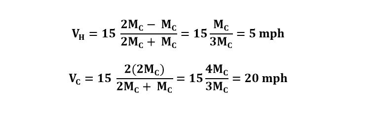 So is Cassie shooting off faster than Henri’s initial velocity possible? Let’s plug in some numbers and find out. First we’ll assume that Henri was moving at 15 mph when she hit Cassie. Now Henri is a somewhat private cat and wouldn’t want me revealing her weight. However, I don’t think she’d mind me saying she weighs twice as much as Cassie. Now let’s punch all these numbers into the Cat Computer and see what we get.