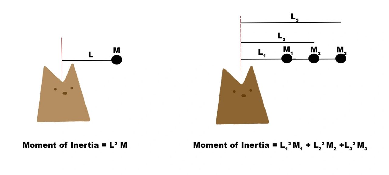 Sure seems complicated doesn’t it. Let’s try and simplify it. Imagine you have a ball tied to a string and you want to swing it around your head. Your good friend (who always has to outdo you) does the same thing with three balls tied to a string. As you can see in the picture below, the moment of inertias are just a function of the mass of the balls and the distance from the center point.