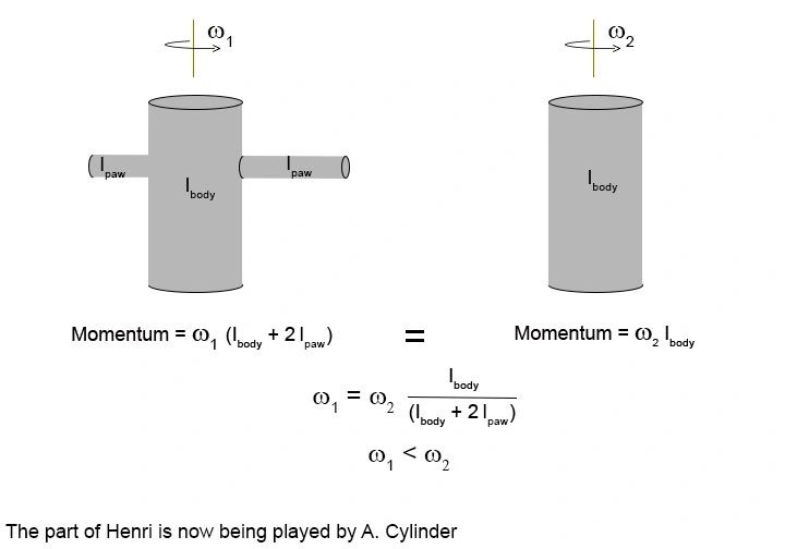 So far so good, but what about something more complicated such as an ice skating cat. Actually the principle is the same, although the mathematics are much more involved. However, for our purposes we don’t really need to know Henri’s moment of inertia. All we’re concerned about is her paws.