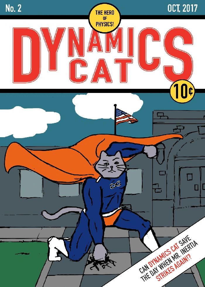 “That’s because you forgot one thing, Mr. Inertia,” explains Dynamics Cat. “By increasing my inertia, you also increased the amount of kinetic energy I generated while falling. It was enough to destroy your machine and free me from its effects.”