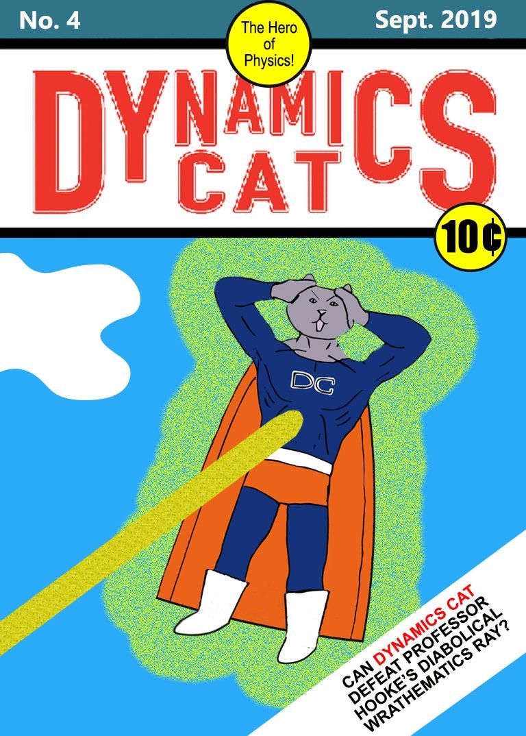 Dynamics Cat tries to fly out of the way, but a bright yellow beam hits him in the chest. Suddenly, even the most basic dynamics concepts vanish from his mind. As he plummets earthward, he can’t even remember the name of the thing making him fall. Hitting the ground hard, Dynamics Cat rolls several hundred feet before coming to rest against a boulder.