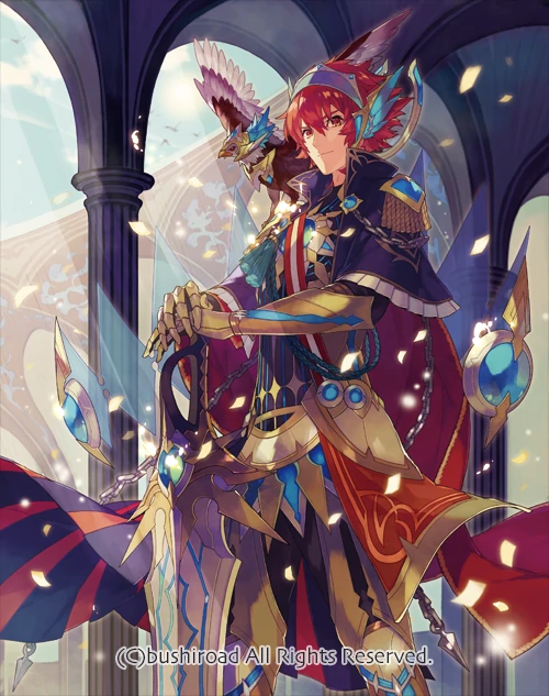 The knight has orange eyes, red hair, and wearing a long dark blue shirt under armor full of gold. It has the symbol of the sun on his chest with a blue orb in the middle. A long red cloak falling to his heels. Wearing Sky blue wing-shaped hair ornaments on both sides of his head. If I were to describe with the way Weebs say, he is an ikemen. His name is Gurguit.