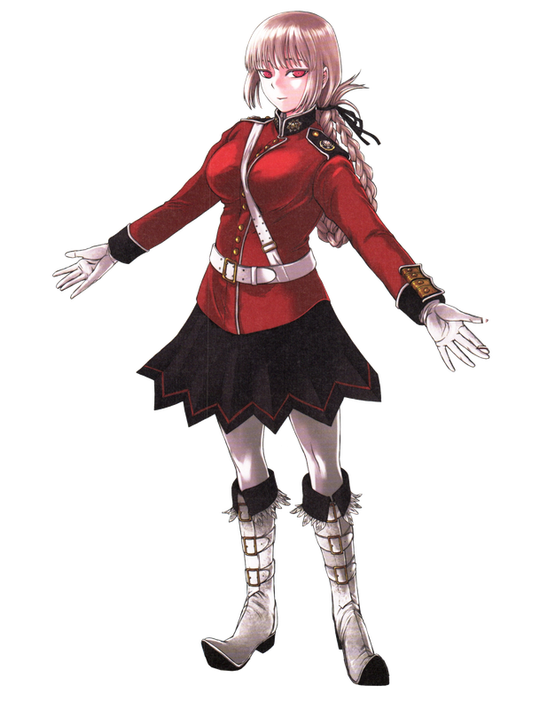 The light shone and there is a woman who has long braided silver pink hair and red eyes. She wears a red coat and a black skirt with red trim, with white boots and gloves.