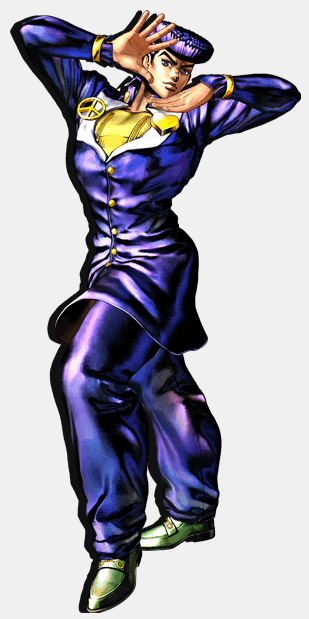 Wait, why is my body moving on my own? Don't tell me?! Someone help me! My body is moving with my body facing forward, placing the right arm parallel to the chin with my arm and palm flat, facing the palm down, and the left arm raised angularly to cover the top of my head with the palm facing out and hand spread wide open. Wait! Isn't this, one of Josuke's typical poses?