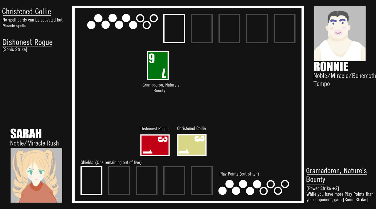 Sarah turned her other card sideways. Normally a six play point spell, Victorious Claim turned all cards on her side of the field sideways leaving it in a state called ‘Strikeless’. Whenever a creature attacks, it ‘strikes’ leaving it ‘strikeless’, making it open to attacks from other creatures and disallows it from attacking again until it regains it’s strike at the beginning of her next turn. Dishonest Rogue already used it’s strike, but this left her Christened Collie open for attacks as well, ending the “‘Miracle’ spell only” effect when it leaves the field. This would allow her opponent to play all sorts of spells and traps to affect the battlefield.