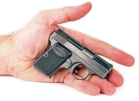 Sera receives a tiny pistol from him. Its size is smaller than her hand.
