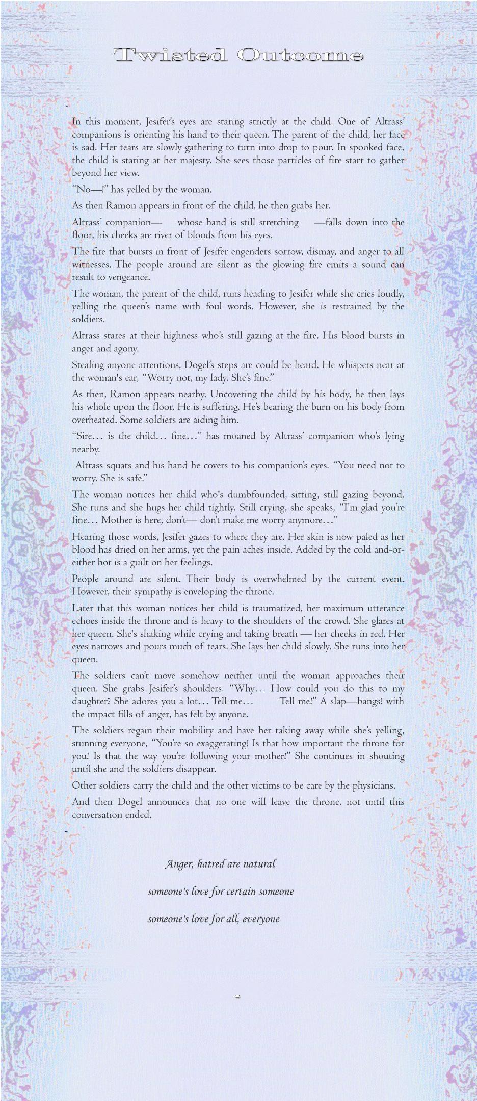 The soldiers can’t move somehow neither until the woman approaches their queen. She grabs Jesifer’s shoulders. “Why… How could you do this to my daughter? She adores you a lot… Tell me… Tell me!” A slap—bangs! with the impact fills of anger, has felt by anyone.