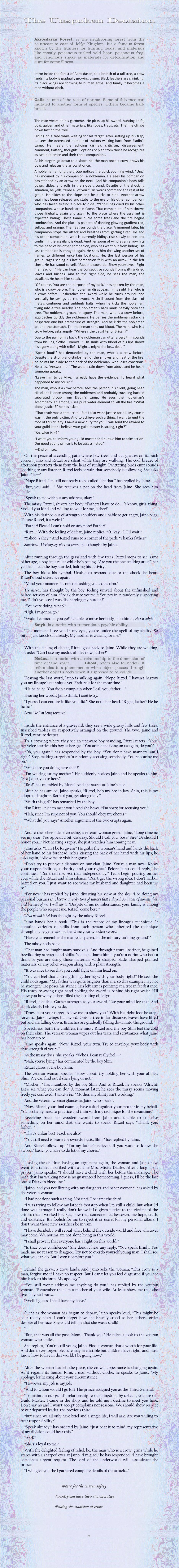 The man, who is a crow before, sees the person, his client, going near. His client is once among the noblemen and probably traveling back in separated group from Eladin's camp. He sees the nobleman's accompany, an emode, uses pure water element to kill the fire. “What about justice?” he has asked.