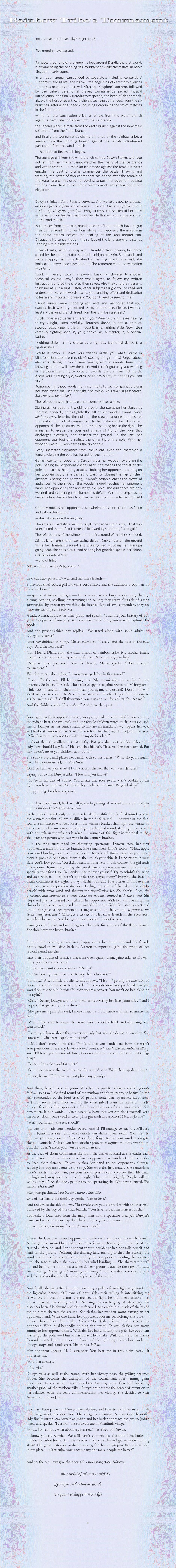 And there, back in the kingdom of Jelfyr, its people celebrate the kingdom's festival, so as well the final round of the rainbow tribe's tournament begins. In the ring surrounded by the loud cries of people, contenders' sponsors, supporters, and fans, including visitors; wearing the dress gifted from the mysterious lady, Duwyn faces her first opponent a female water emode of the water branch. She remembers Jaino's words, “Listen carefully. Now that you can cloak yourself with the force, cloak your sword as well. (The girl nods in responds) Now fight me.”