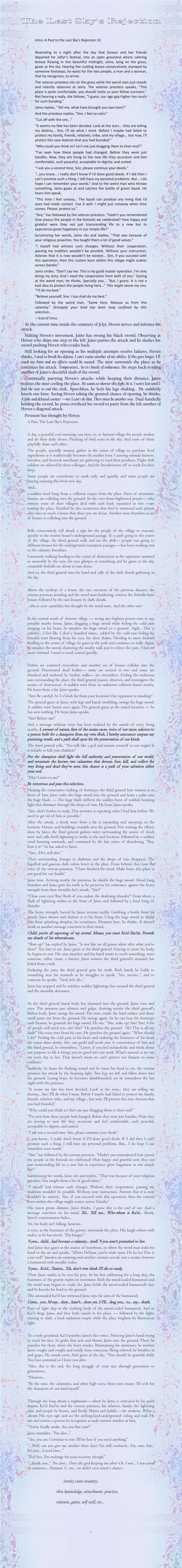 Through the long dream a nightmare— where he Jaino is criticized by his guild master, Ka'el Em'tis and the veteran priestess, his relatives, family, the lightning clan, and people he knows, and finally Misisa and Judith, —he awakens. What a dream. His eyes ogle and see the arching-land-underground ceiling and wall. He sits and notices a person he recognizes as male warrior watches at him.