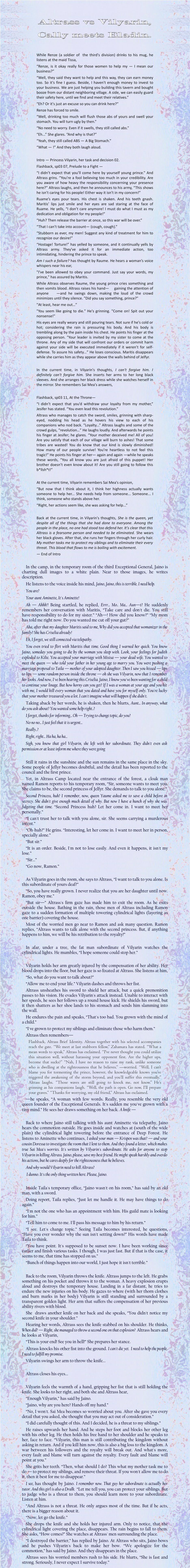 Back at the current time, in Vilyarin's thoughts, She is the queen, yet despite all of the things that she had done to everyone. Among the people in the place, no one had stood too defend her. It's clear that this Altrass is a fearsome person and needed to be eliminated. She wears her black gloves. After that, she runs her fingers through her curly hair. My mother tasks me to protect my siblings and to eliminate their every threat. This blood that flows to me is boiling with excitement.