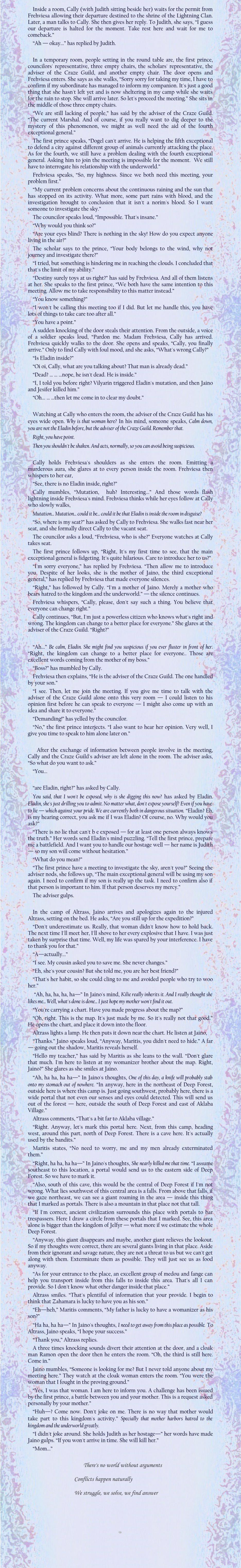 “Right,” has followed by Cally. “I'm a mother of Jaino. Merely a mother who bears hatred to the kingdom and the underworld.” — the silence continues.