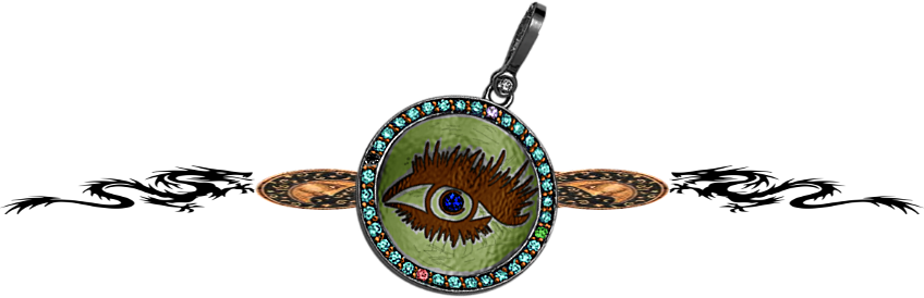 It’s a circular form of tarnished silvered steel. ringed in clear teal quartz with four gems placed, at intervals in between. A Diamond at the very top, just under the loop. A Peridot to the right, Red Cinnabar at the bottom and Black Beryl, three quarters of the way around. In the center, in hammered brass, there’s a relief of a woman’s eye. The center of which is a dazzling blue sapphire.