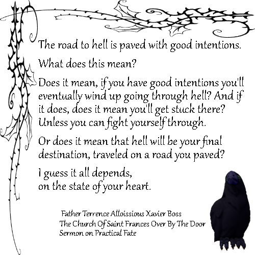 Brahms, takes a sip from his flask. Remembering a conversation from before the day his nephew was born. He furls his brow and speaks softly, “When they have a kid, some of the bearers can’t wear that anymore. There’s a part of them that changes. Maternally. They get the urge to center their focus on their child. But that pendant keeps them rooted in the ‘all are my children’ feeling. They start losing sleep, get headaches. And generally they’re constantly annoyed. Eventually it has to come off. Sometimes it winds up in a box, without them ever realizing they put it there."