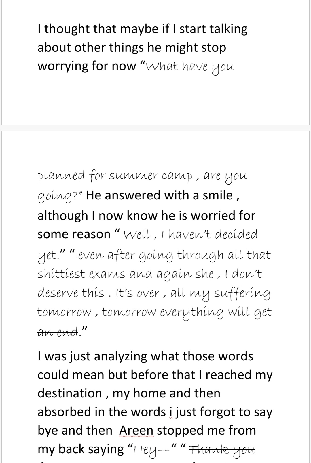 The world around me froze , and I was in a shock and an unchangeable fact was in front of me , my one and only friend was dead lying on the sand ground , I wanted to cry so much , I wanted to ask just why ? Why did you do this ? We were just talking yesterday and now see. Life is weird , I said see you tomorrow yesterday and now today your tomorrow never came. Tears were just going to make their way from my eyes to cheek.
