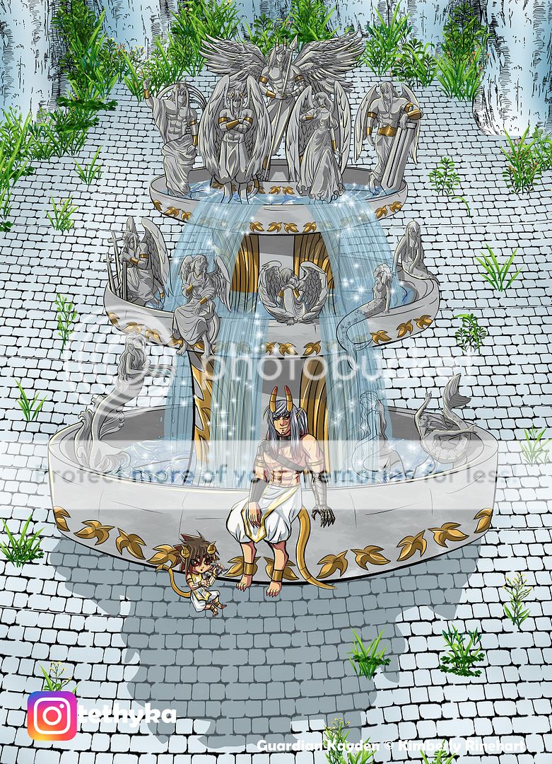 A large three-tiered stone fountain stood in the center of the Grand Gardens with figures with wings, horns, and merfolk. A tall and imposing man sat at the edge of it with a young boy sitting near his feet with figurines in his hands. The boy had horned wolf figurines in his hands.