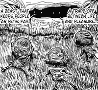 "I'm trying to contact little momo, but she didn't try to send back a sign or message, so I guess its okay" Dekar create a small hut for [[ Brion ]] to live