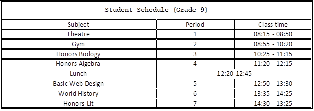 So of course, I've just been my usual, introverted quiet self around all of these new classmates. I've got my class schedule for the year, and I've already become acquainted with many other high school girls. In a place with so many new strangers, my popularity starts from ground zero, just like everybody else. I don't personally mind being unpopular; I just wish someone would notice me or give me any thought. Oh, and here is the schedule I'll be dealing with this time around.