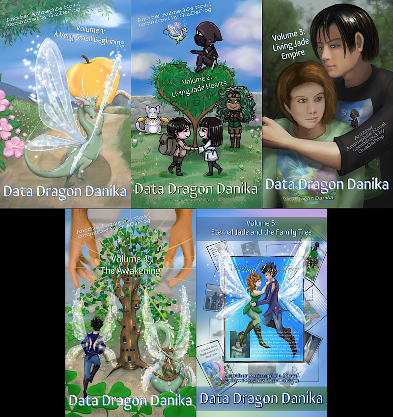 Data Dragon Danika - Volume 5: Eternal Jade and the Family Tree Kindle - https://www.royalroad.com/amazon/B085X8DRHB Data Dragon Danika - Volume 4: The Awakening Kindle - https://www.royalroad.com/amazon/B0828KVJXR I've only posted this one to Amazon (where all but 3 purchases have been made.) Data Dragon Danika - Volume 3: Living Jade Empire Kindle - https://www.royalroad.com/amazon/B07V2W54QX Apple - https://books.apple.com/us/book/data-dragon-danika/id1472907386 Android - https://books.google.com/books/about?id=AhWiDwAAQBAJ Data Dragon Danika - Volume 2: Living Jade Hearts Kindle - https://www.royalroad.com/amazon/B07QR1C53Q Apple - https://books.apple.com/us/book/data-dragon-danika/id1460037305 Android - https://books.google.com/books/about?id=YKGSDwAAQBAJ The super cute Chibis on the cover of Volume 2 were created by Izulio! https://www.deviantart.com/izulio Data Dragon Danika - Volume One: A Very Small Beginning Kindle - https://www.royalroad.com/amazon/B07NV7KPB9 Android - https://books.google.com/books/about?id=6FnsDwAAQBAJ